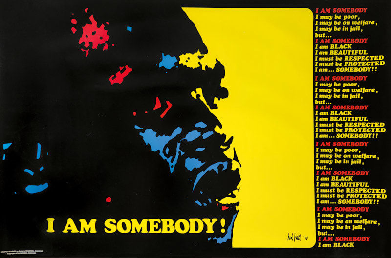 Four-color poster. Dynamically printed with a semi-silhouetted portrait of a Black man, the poster weaves together the threads of the Civil Rights movement of the 1950s and 60s to the struggle for acknowledgement and implemented equality in the 1970s. "I Am Somebody" was written by Reverend William Holmes Borders, Sr., who, from the 1940s through the 1980s, advocated for civil rights and economic reform in Atlanta. In 1971, Jesse Jackson recited the poem on Sesame Street, a unique public venue, but a significant one, for a declaration of racial equality. Bruce worked in the art department of CBS, but contributed this and other Day-Glo images to Gráfica Studio, as well as to the Johnson Publishing Company, which administered the magazines Ebony and Black World. Minimal, if any, edgewear. Fine. Framed. (Measures 24 by 36 in.)
